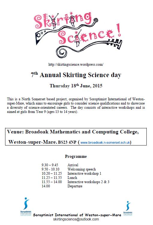 The Skirting Science team are looking forward to June 18th 2015 when this year’s annual event is to be held again at Broad Oak. Members of Soroptimist International of Weston super Mare are preparing to make this event as successful as ever under the stewardship of Ruth and her team who have yet again organised a wide selection of workshops to enthuse female students. The provisional programme may be viewed :Skirting Science Draft Programme 2015 v2